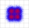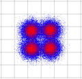 Linkes und rechtes Bild: Hier bekommt der blaue „Morsepip“ 4 Informationen (QAM 4). Das rechte, weniger verrauschte Bild entsteht bei klarerem Funksignal. In je mehr Einzelpunkte der blaue Punkt (der „Morsepip“) aufgeteilt wird, desto mehr Informationen können diesem mitgegeben werden. Für 4G wird QAM 4 bis 256 genutzt. Bei 5G werden Werte bis QAM 4096 angestrebt.